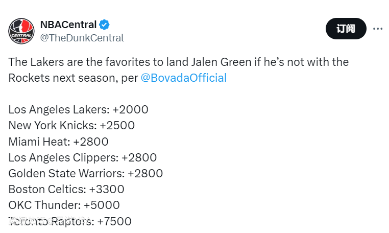 2025-05-06 05:30北京时间5月6日,火箭出局后,交易杰伦-格林的呼声越来越高。他的最新下家赔率也已经出炉,如果离开火箭,他最被看好加盟哪支球队?湖人目前排名第一,勇士位列第三。