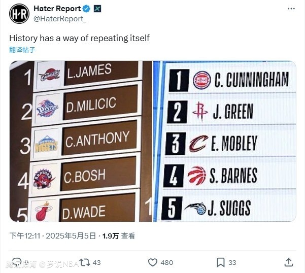 在抢七大战上,杰伦-格林依旧低迷,全场8中3仅得8分。赛后,有美媒晒出2003和2021选秀对比图:坎宁安对应詹姆斯、杰伦-格林对应米利西奇、莫布利对应安东尼、巴恩斯对应波什、萨格斯对应韦德。配文则是:“历史正在以某种方式重现。”
