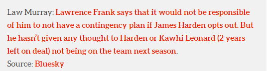 弗兰克还表示,如果哈登选择跳出合同,自己若没有应急预案,那是不负责任的。但他还没有考虑过哈登或者莱昂纳德(合同还剩两年)下赛季不在球队的情况。