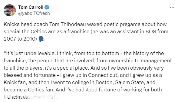 锡伯杜谈到了自己作为凯尔特人队助教的历史,他说道:“这简直令人难以置信。我认为,从上到下,这支球队的历史,参与其中的人们,从球队老板到管理层再到所有球员,这都是一个特别的地方。所以很明显,我非常幸运,能先后为凯尔特人和尼克斯工作。”