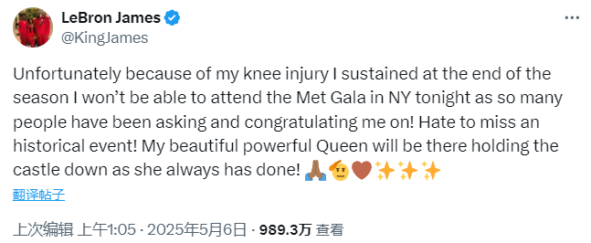 詹姆斯写道:“很遗憾,由于我在赛季末膝盖受伤,今晚无法出席纽约的大都会艺术博物馆慈善舞会(Met Gala)了,很多人都在询问并祝贺我能参加呢!真不想错过这么一场具有历史意义的活动啊!我美丽又强大的女王会像以往一样出席并撑住场面的!”