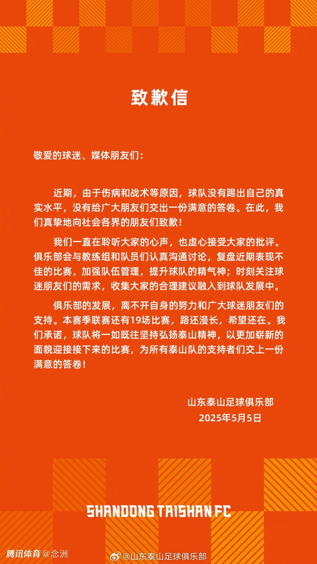 敬爱的球迷、媒体朋友们:近期,由于伤病和战术等原因,球队没有踢出自己的真实水平,没有给广大朋友们交出一份满意的答卷。在此,我们真挚地向社会各界的朋友们致歉!