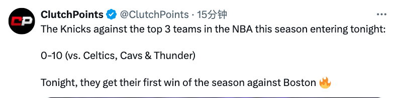 本赛季,尼克斯队在对阵联盟排名前三的球队时(凯尔特人、骑士、雷霆),战绩为0胜10负,随着这次在半决赛G1击败凯尔特人,他们也终结了自己在对阵这些球队10连败的纪录,获得首场胜利。