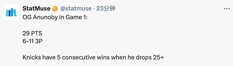 本场比赛,阿奴诺比首发出战45分钟,20中10,三分球11中6,拿到29分4篮板3助攻1抢断。据统计,当他拿到25+得分时,尼克斯已经取得了5连胜。