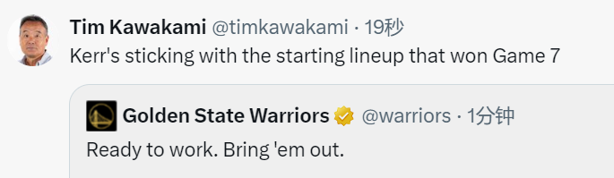 勇士vs森林狼首发出炉:科尔沿用抢七主力阵容 库里对决爱德华兹