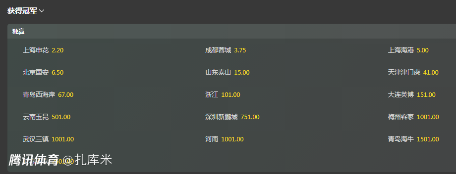 中超夺冠赔率:蓉城反超海港升至第2,国安仍列第4,泰山第5有掉队趋势