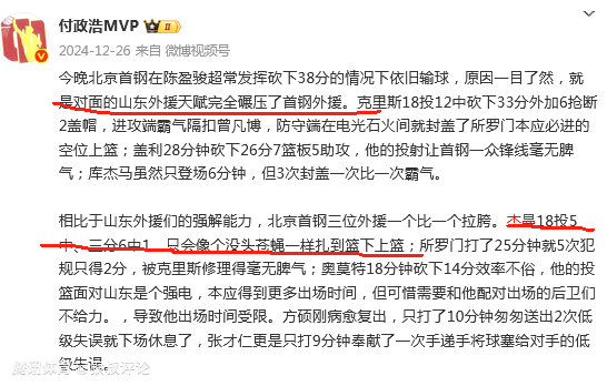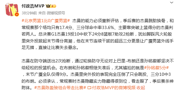 此前多次吐槽杰曼的能力无法达到季后赛顶级球队需求的媒体人付政浩被征服了,赛后发文点评说道: