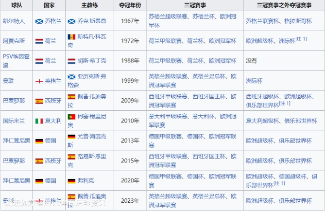 欧洲足坛历史上的三冠王(联赛冠军+杯赛冠军+欧冠冠军):