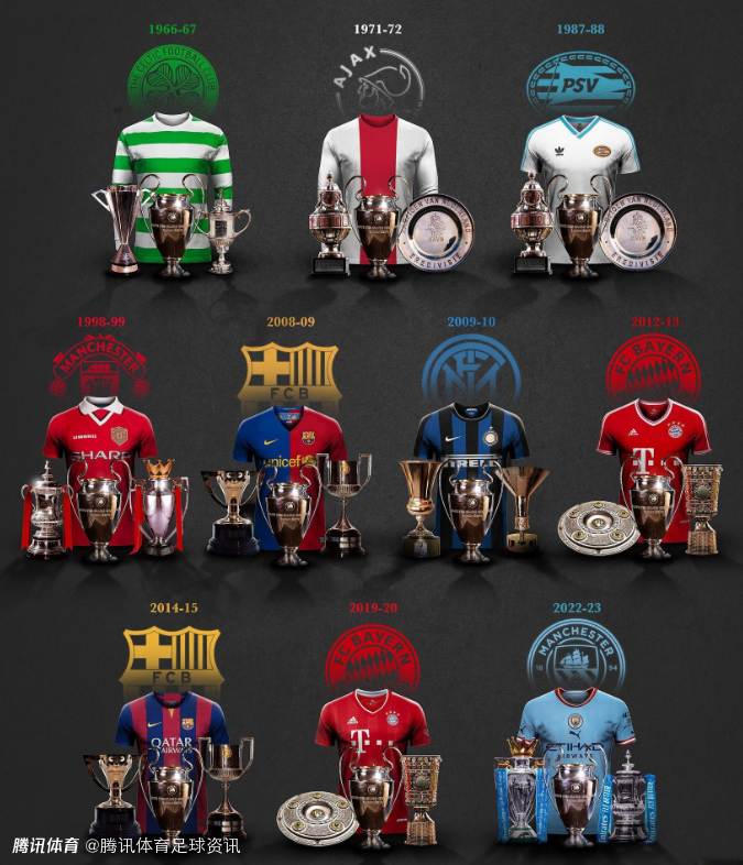 凯尔特人、阿贾克斯、埃因霍温、曼联、巴萨x2、国米、拜仁x2、曼城