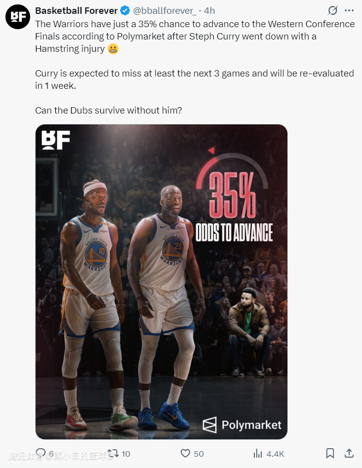 因为库里的受伤至少要缺席三场系列赛,数据媒体Polymarket预测,勇士队击败森林狼队晋级西决的概率只有35%,就算现在勇士1-0领先森林狼也并不占优。因为库里的腿筋伤势,这支勇士还能一黑到底吗?