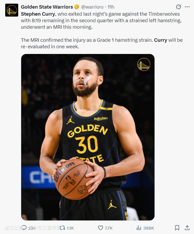 2025-05-08 16:00北京时间5月8日,勇士官方宣布斯蒂芬-库里伤情,库里左腿筋是一级拉伤,他将在一周后重新接受评估。库里是在对阵森林狼的G1第二节还剩8分19秒因为左腿筋拉伤退场,核磁共振显示他左腿筋一级拉伤。