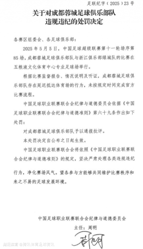 根据比赛监督报告、情况说明及听证,成都蓉城足球俱乐部队存在延迟抵达体育场的行为,未按规定时间完成官方比赛流程。