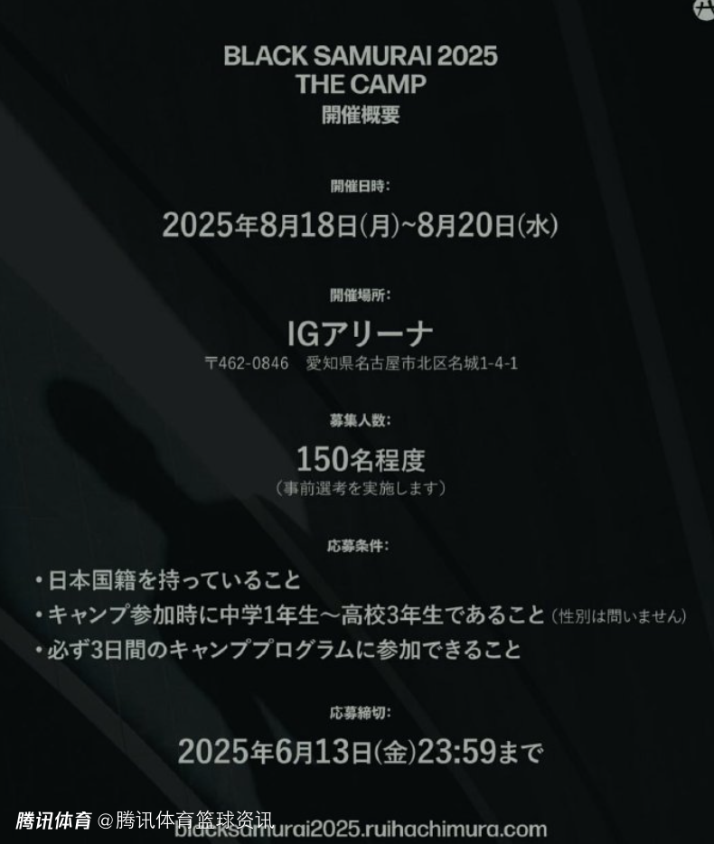 2025-05-08 19:50北京时间5月8日,八村垒在个人社媒宣布自己将举办“黑武士训练营”,地点定在名古屋的IG体育馆,时间定于8月18号-20号,届时将有150名持日本国籍的初高中球员参加。