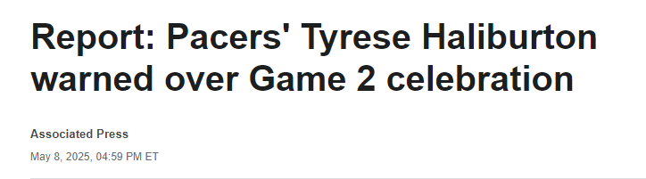2025-05-09 06:00北京时间5月9日,据美联社报道,步行者球星哈利伯顿确实在G2完成三分准绝杀后跳了“大蛋舞”,但他逃过一劫,只被联盟警告,没有被罚款。