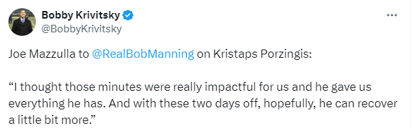 马祖拉说道:“我认为波尔津吉斯上场的那些时间对我们来说真的很有影响力,他倾其所有为我们效力。在这两天的休赛期里,希望他能恢复得更好一些。”波尔津吉斯在次轮前两场比赛中均受到病情困扰,第一场比赛他首发出战13分钟并提前退出比赛,没有得分贡献4篮板1助攻,第二场比赛他替补登场14分钟,贡献8分4篮板。