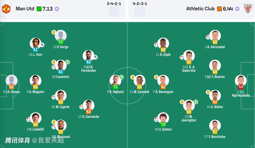 曼联首发:24-奥纳纳、2-林德洛夫(81'41-哈里-阿马斯)、5-马奎尔、15-约罗、3-马兹拉维(62'23-卢克-肖)、18-卡塞米罗(81'37-梅努)、25-乌加特(62'7-芒特)、13-多古、8-B-费、9-霍伊伦、17-加纳乔(62'16-阿马德-迪亚洛)