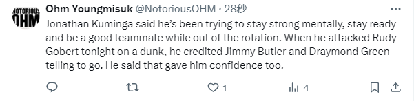 库明加谈到了自己此前被DNP时的经历,他表示:“在没有进入轮换阵容期间,我也一直努力在精神上保持坚强,随时做好准备,并成为一名出色的队友。”