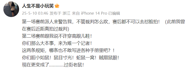2025-05-10 09:00北京男篮跟队记者刘茹10日凌晨更新社媒,称自己在广厦队的两个主场先后被告知赛后不能近距离拍摄裁判、不许穿高跟鞋。她表示这两条规矩都不在各种手册里,她称“你们胆小如鼠、蛇鼠一窝”。