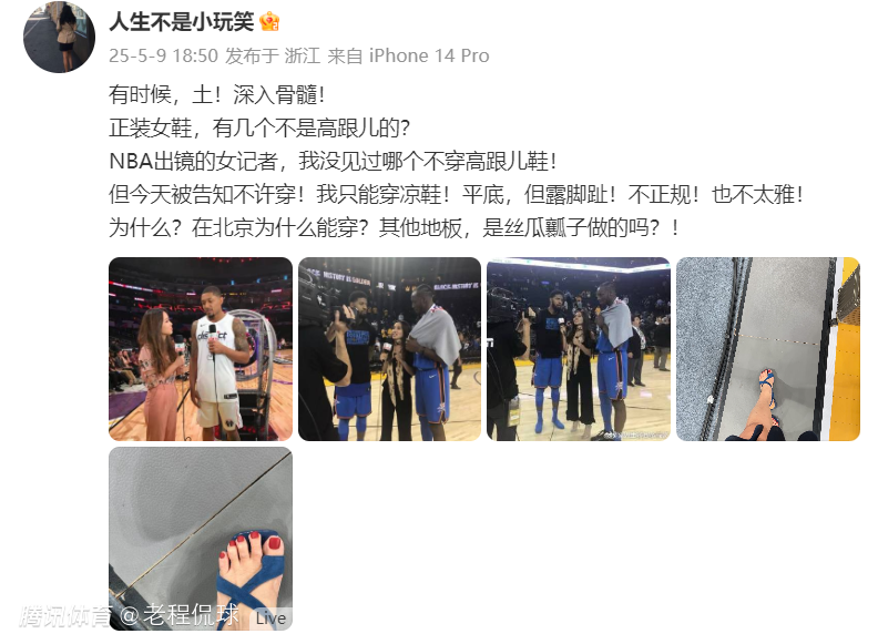 昨晚,刘茹就在社媒上透露她被告知不能穿高跟鞋,为此,她只能穿平底凉鞋。对于广厦主场的做法,刘茹吐槽:“有时候,土!深入骨髓!正装女鞋,有几个不是高跟儿的?NBA出镜的女记者,我没见过哪个不穿高跟儿鞋!”