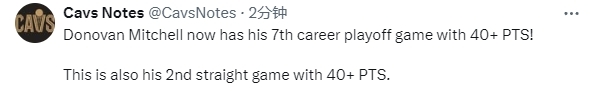 米切尔季后赛生涯第7次单场40+ 1数据比肩詹姆斯成队史第2人