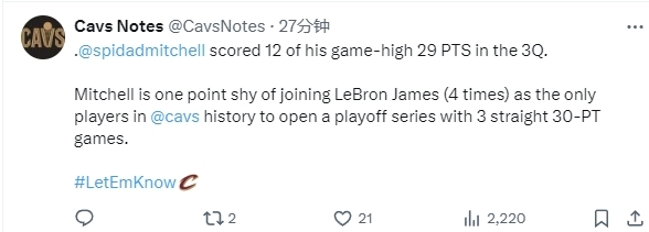 本场比赛,米切尔的手感火热,在前三节比赛中他就已经拿到了29分,距离比肩詹姆斯仅差1分。第四节比赛结束前8分7秒,米切尔中投得手,随后又三分远投命中,接着助攻斯特鲁斯三分再中,在自己完成里程碑的同时,也打停了步行者队,基本杀死了比赛悬念。暂停过后,米切尔继续砍分,很快让自己的得分突破40+,这是他职业生涯第7次在季后赛中单场砍下40+,也是他连续两场在季后赛中砍下40+。
