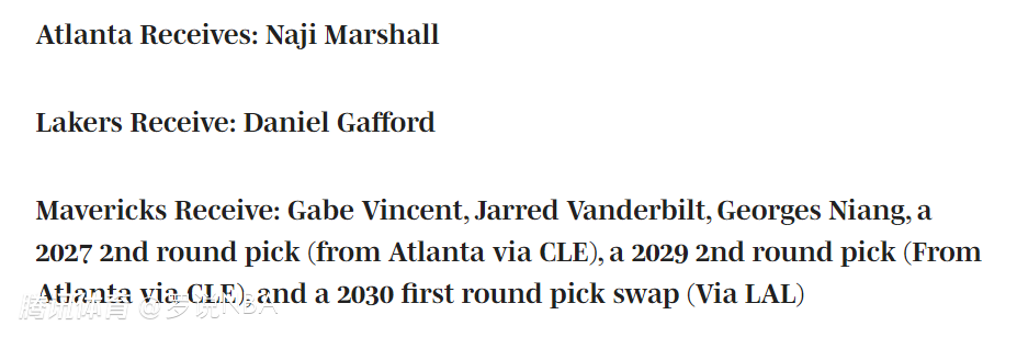 独行侠得到:文森特、范德比尔特、尼昂、一个2027年次轮(来自老鹰)、一个2029年次轮(来自老鹰)和一个2030年首轮互换权(来自湖人)