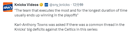 谈到尼克斯队在第三场失利中的防守问题时,唐斯说道:“他们能成为卫冕冠军是有原因的,今晚他们展现出了自己的实力。” 在被问到在这轮系列赛中,尼克斯队大比分落后凯尔特人队是否有共同的原因时,唐斯表示:“在季后赛中,执行力最强且能长时间保持执行力的球队通常会笑到最后。”