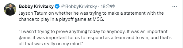 谈到排除外界对凯尔特人队投篮选择的干扰时,塔图姆说道:“我不会太在意那些。这是季后赛,这是一年中最重要的时刻。基本上每场比赛后都会有不同的说法,不要在赢球或输球后情绪起伏太大。” 塔图姆在被问到在麦迪逊广场花园打季后赛是否想通过比赛证明些什么时说道:“我今天不想向任何人证明什么。这是一场重要的比赛。作为一个团队做出回应并赢下比赛,这才是我真正关心的。”