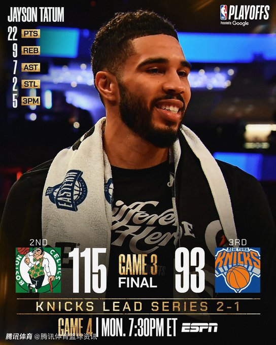 关于球队在常规赛和季后赛中客场表现比主场更好的情况,塔图姆表示:“主场优势很重要。在我们的球迷面前表现出色也很重要。我们非常珍视球迷的支持。但与此同时,如果你想变得强大,如果你想变得特别,你就得在客场赢下比赛。” 谈到从与训练师德鲁-汉伦的合作中获得的信心时,塔图姆说道:“这只是其中一部分。这是一个漫长的赛季,在有些阶段,也许你不需要做出任何改变,但你需要去训练馆,多投投篮。信心就来源于你付出的所有努力。” 关于如何应对外界对他的批评,塔图姆表示:“你要明白作为核心人物会面临什么。我生活得很好,我得承认这一点。”他指出,他理解在得到赞扬和荣誉的同时也会受到批评。他还补充说,他不是那种会板着脸走进球馆并表现出愤怒的人。那样做并不真实。 关于自己在本场比赛摆脱投篮困境(三分球9投5中)的表现,塔图姆回应道:“当你的投篮命中,感觉良好且充满信心时,这种感觉很棒。但这并不是比赛的全部,比赛中还有很多其他因素。”