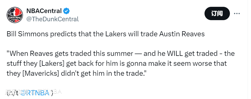 比尔-西蒙斯在播客节目中表示:“里夫斯今年夏天肯定会被交易,湖人队从这笔交易中得到的回报,会让独行侠当初没换来他显得更加失策。”