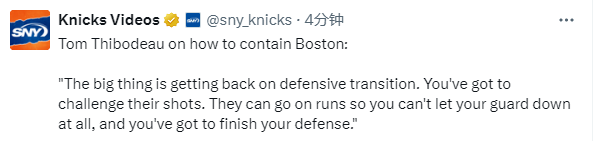 截至目前,尼克斯在本轮系列赛中2-1领先于凯尔特人,两支球队的第4场比赛将在今天上午7点半展开。