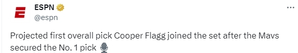 2025-05-13 08:50北京时间5月13日,2025年NBA选秀乐透抽签仪式结束,独行侠队获得状元签。今年选秀大会的状元大热门库珀-弗拉格接受媒体采访,表示期待自己能加盟独行侠,联手浓眉和欧文。