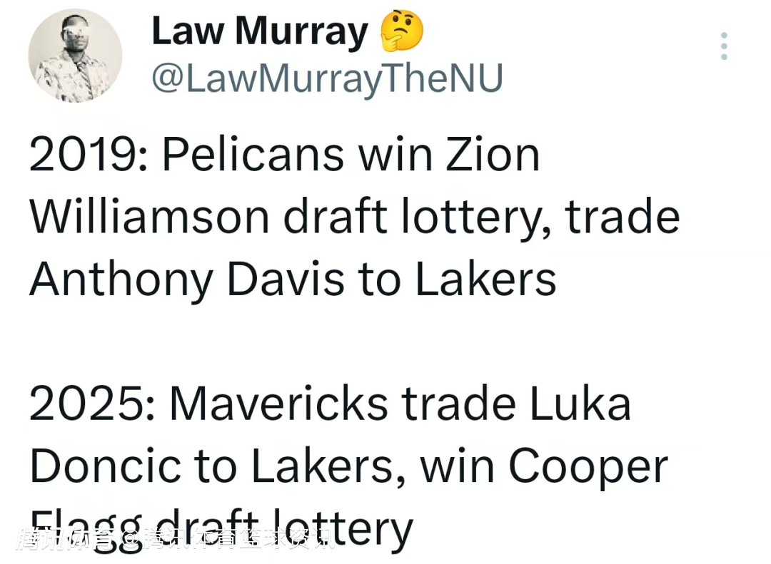 鹈鹕队爆冷抽中状元签,选中锡安,随后将安东尼-戴维斯交易至湖人。