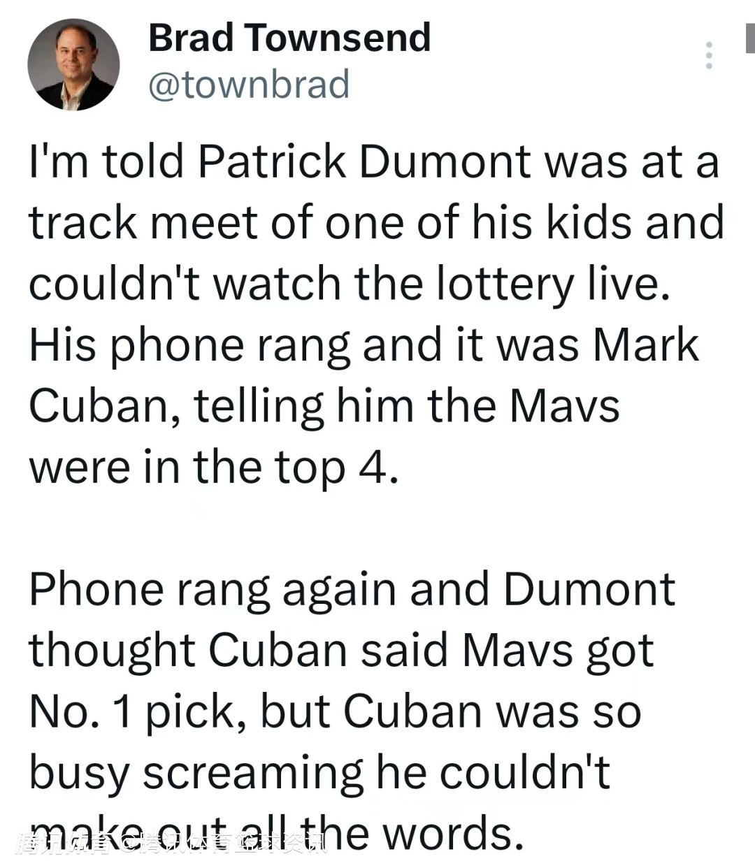 据悉,独行侠老板杜蒙特当时正在参加一个孩子的田径比赛,没能观看乐透抽签直播。他的电话响了,是库班打来的,告知他独行侠队抽到了前四顺位。电话再次响起时,杜蒙特以为库班说独行侠拿到了状元签,但库班当时兴奋得大喊大叫,他几乎听不清对方说的每一个字。