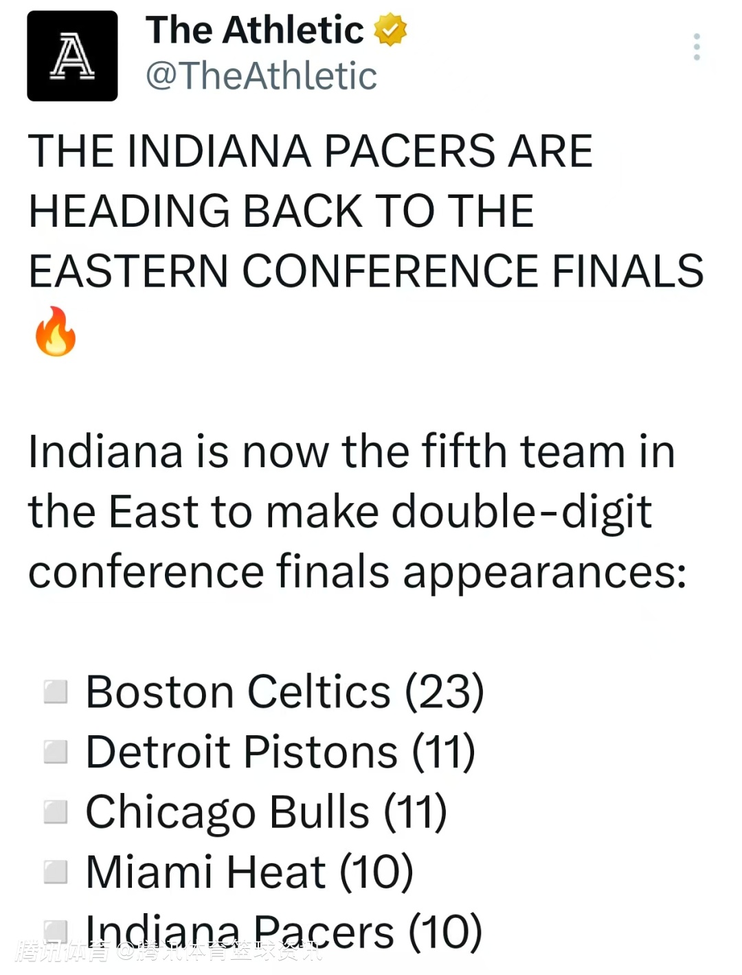 队史壮举再现!步行者连续两年挺进东部决赛 晋级次数并列东部第四