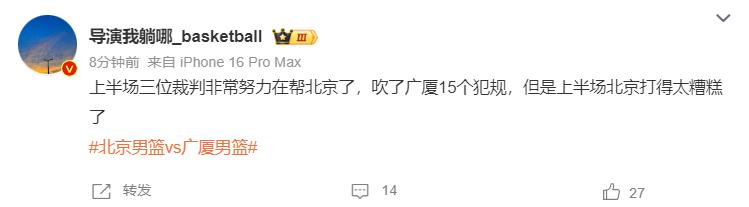 媒体人:上半场三位裁判已经努力在帮北京了,吹了广厦15个犯规,但北京自己打得太糟糕。