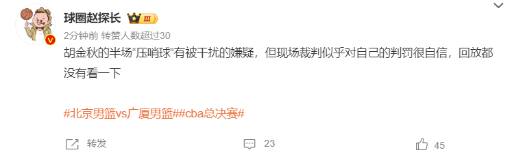 赵探长:胡金秋半场的“压哨球”有被干扰的嫌疑,但裁判似乎对自己的判罚很自信,回放都没看。