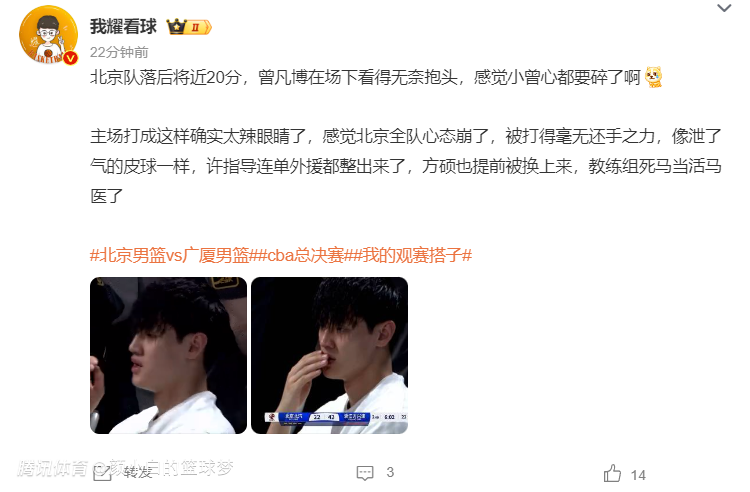 博主:小曾心碎了,主场打成这样太辣眼睛,北京全队心态崩了,被打得毫无还手之力,许利民连单外援都来了。