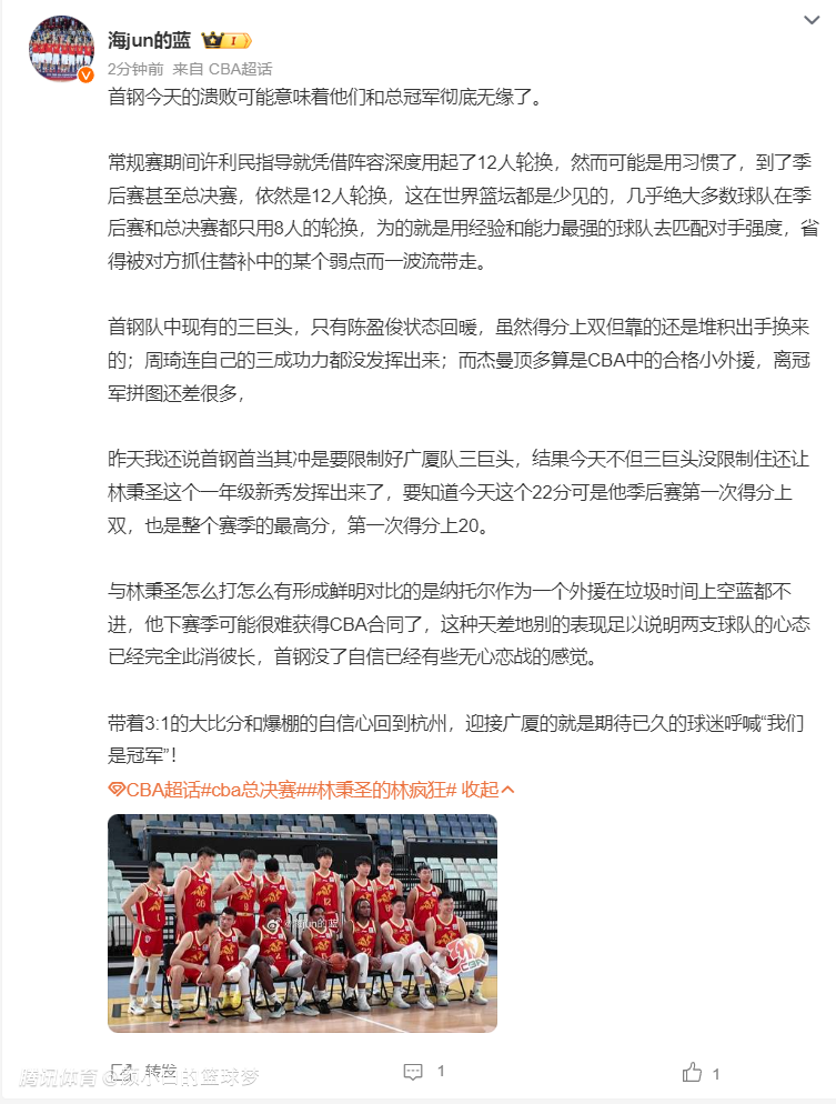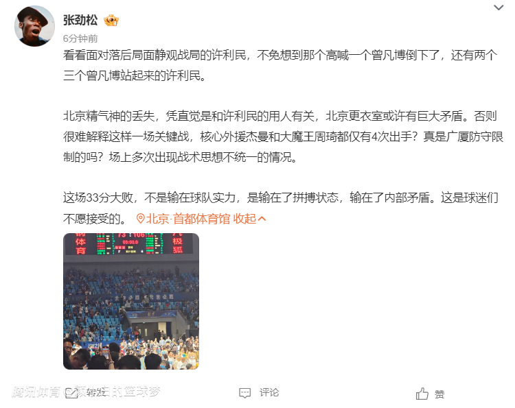 张劲松分析:北京的精气神全丢,感觉与许利民的用人有关,北京更衣室或许有巨大矛盾,否则很难解释关键战溃败,核心外援杰曼与大魔王周琦都只有4次出手,这真是广厦限制的吗?场上多次出现意见不统一的情况。