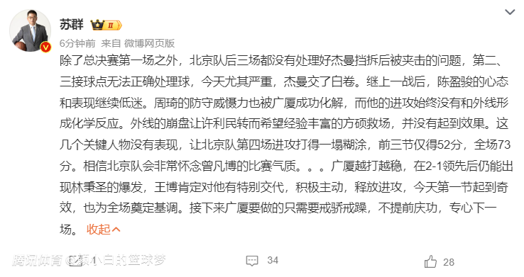 苏群:北京后三场都没有处理好杰曼挡拆被夹击的问题,没有第二、三接球处理球的点;陈盈骏表现继续低迷,周琦防守端的威力也被广厦化解;许利民甚至希望方硕救场令人无奈。只要广厦戒骄戒躁不提前庆功,专心下一场(4-1)。