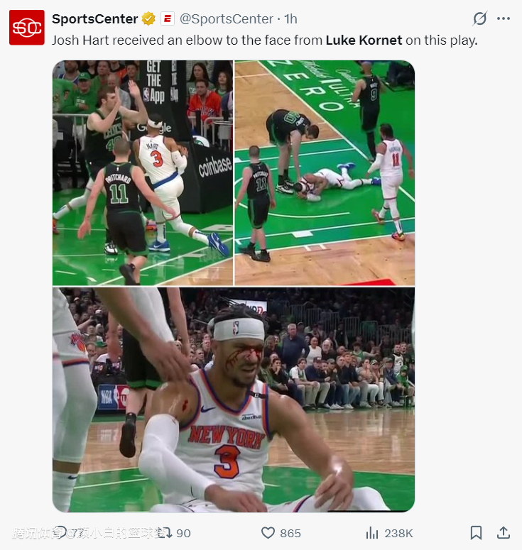 上半场科内特在一次防守哈特的过程中肘击到哈特的眼眶的问题,哈特是血染赛场,除了这一幕外科内特的表现已经很出色,首节6分钟4分3篮板1助攻1抢断1盖帽,次节他没登场。
