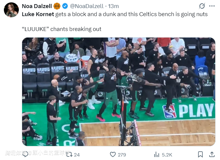 科内特暴扣后点燃了绿凯替补席与北岸花园球馆,三节科内特16分钟,4中4拿到8分8篮板6盖帽,正负值+18。