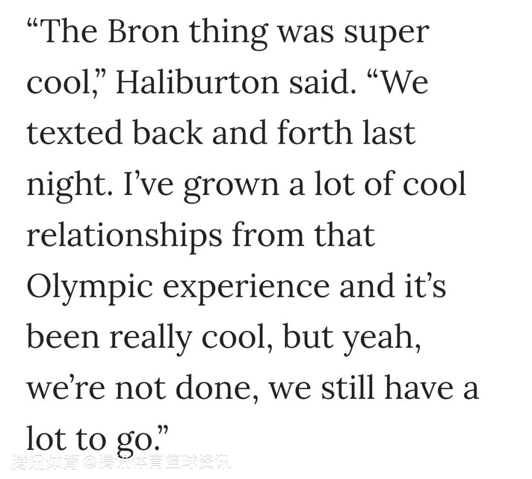 他还提到:“詹姆斯对我的夸奖让我感到非常荣幸,我们昨晚一直在互发短信。在之前的奥运会经历中,我结识了许多很棒的朋友,这是一段很酷的经历。但我们的征程还未结束,还有很多工作要做。”