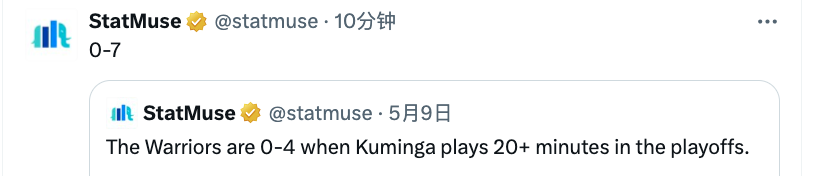 此役库明加替补出战32分钟,23中11拿到26分3篮板。据统计,本赛季库明加在季后赛上场时间达到20+的情况下,勇士遭遇了0胜7负的战绩。