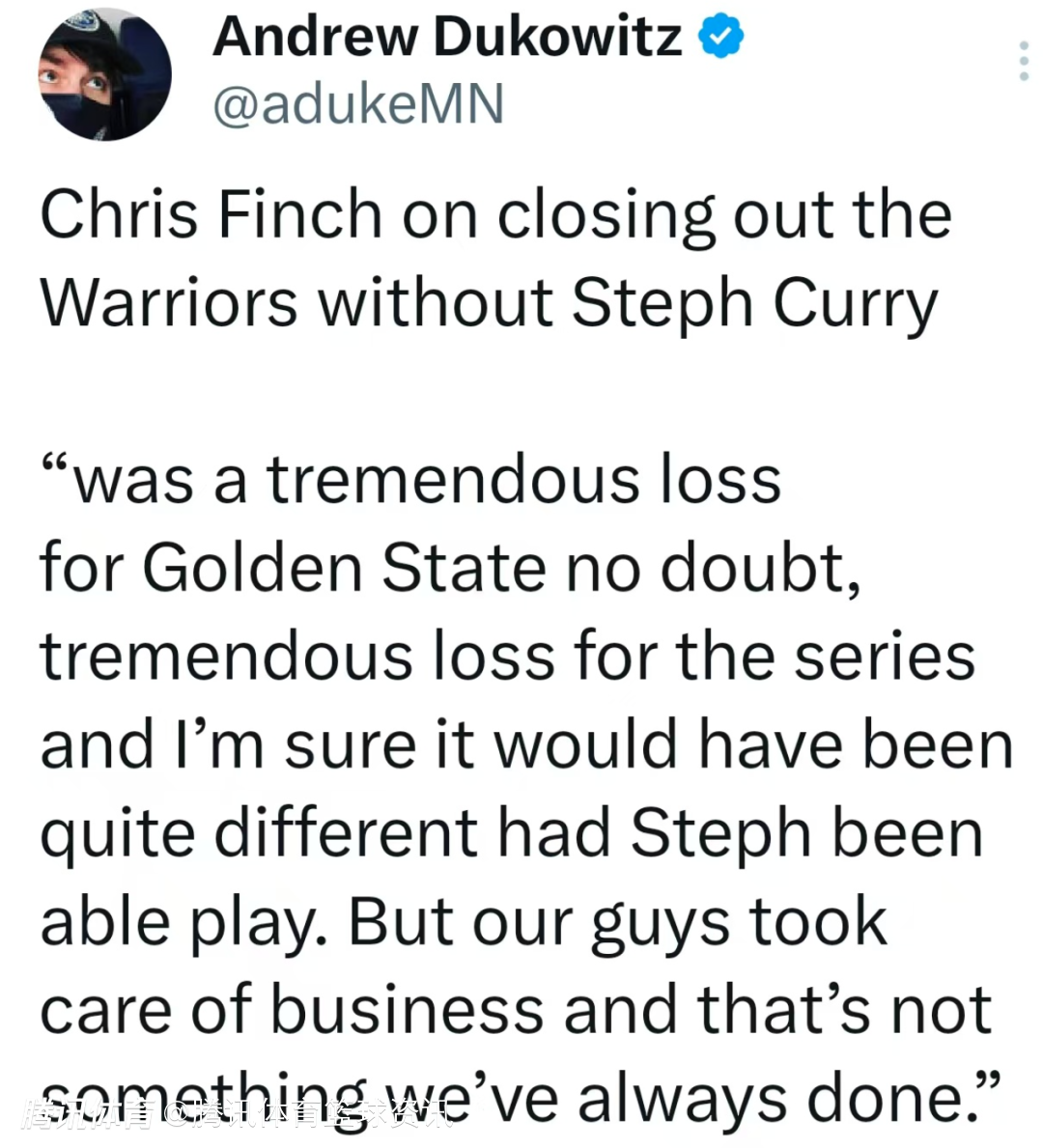 芬奇谈到在库里缺阵的情况下淘汰勇士:“毫无疑问,库里的伤缺对勇士是巨大损失,也极大改变了系列赛走向。如果他能上场,情况肯定大不相同。但我们的球员做好了该做的事,这不是我们一直都能做到的。”