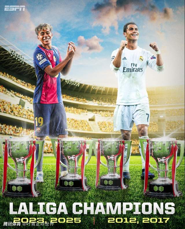 15岁305天的亚马尔,第1次收获西甲冠军;17岁306天的亚马尔,第2次加冕西甲冠军。不到18岁,就有2座西甲奖杯。社交平台上球迷指出,强如C罗,也只有2座西甲奖杯。17岁的亚马尔,成为史上最年轻西甲2冠得主!