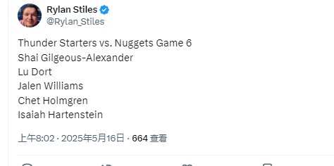 雷霆首发阵容如下:亚历山大、多尔特、杰伦-威廉姆斯、霍姆格伦、哈尔滕施泰因