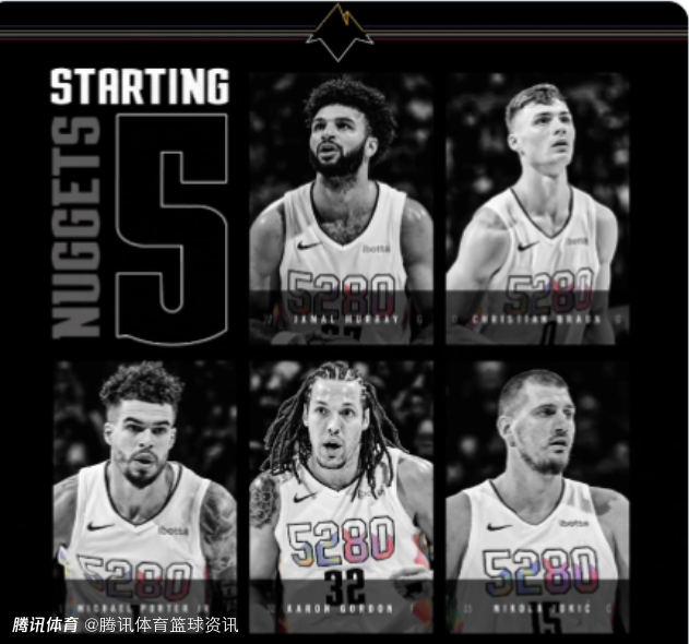 掘金首发阵容如下:约基奇、穆雷、小波特、布劳恩、戈登