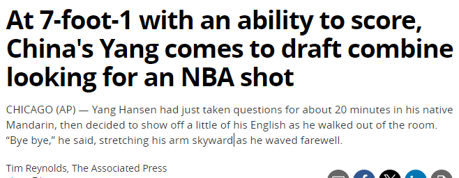 美联社报道杨瀚森:20岁生日正好是选秀大会 他希望向姚明学习