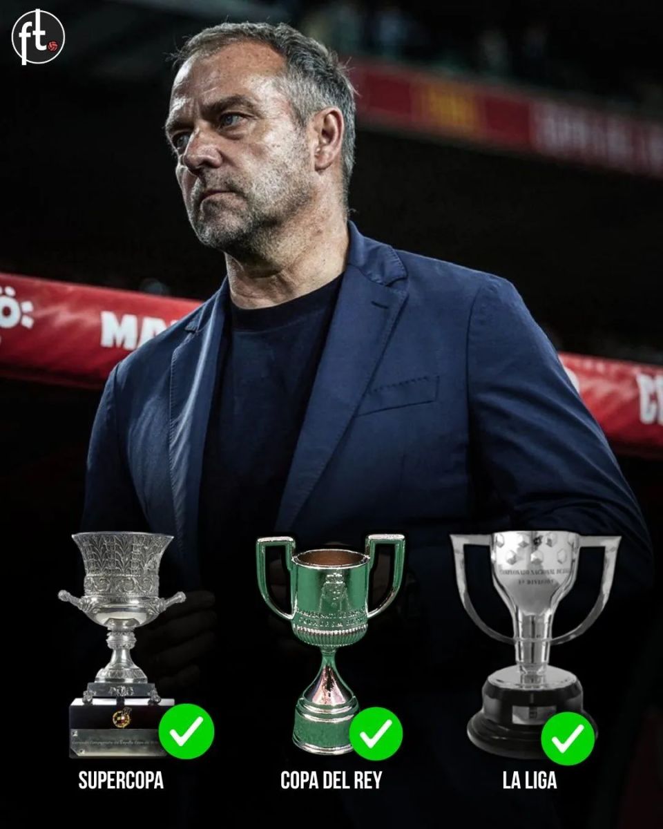 这是1951/52赛季以来,巴萨第9次拿到联赛和杯赛双冠王,上次是2017/18赛季。但更令巴萨人骄傲的是继1952/53赛季以来,巴萨在同赛季内第2次夺得国内三冠王(超级杯、国王杯和西甲冠军)。当年是捷克斯洛伐克名帅道奇克执教,超级杯名称还是杜阿尔特杯。如今是德国名帅弗里克执教,超级杯变成难度更大的海外四队赛。巴萨队史合计13次拿到双冠与国内三冠王擦肩而过,2008/09赛季以来,巴萨8次错过国内三冠王机会,巅峰期瓜迪奥拉“梦三队”都无法达此成就(2008/09赛季的六冠王为同年度,并未拿到2008/09赛季西超杯冠军)。皇马队史只有1988/89赛季拿到过国内三冠王,可见国内大满贯的难度。